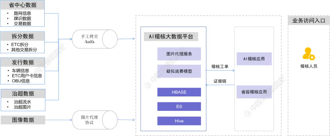 同時,鑒于數(shù)據(jù)存儲介質(zhì)、數(shù)據(jù)存儲類型和數(shù)據(jù)傳輸方式的差異,通過不同工具實現(xiàn)異源、異構(gòu)數(shù)據(jù)的導入。其中,對實時性要求較高的監(jiān)測數(shù)據(jù)以分布式消息隊列的形式由Kafka分發(fā);關(guān)系型數(shù)據(jù)庫由Sqoop等工具直接將數(shù)據(jù)導入HDFS;非實時性數(shù)據(jù)選擇MapReduce計算引擎,實時性要求較高的數(shù)據(jù)選擇Spark或Storm計算框架。3、AI稽核系統(tǒng)流程AI稽核系統(tǒng)流程如圖4所示,可分為4個步驟:(1)省中心數(shù)據(jù)、拆分數(shù)據(jù)、治超數(shù)據(jù)、發(fā)行數(shù)據(jù)等接收匯聚至大數(shù)據(jù)平臺,通過稽核模型數(shù)據(jù)驗證,得到疑似偷逃費數(shù)據(jù);(2)系統(tǒng)根據(jù)疑似偷逃費數(shù)據(jù),自動匹配生成稽核工單和證據(jù)鏈,并推送至省中心稽核平臺及稽核應(yīng)用;(3)省中心稽核平臺將稽核工單和證據(jù)鏈推送至收費站,一線稽核人員確認后提交追繳工單,工單提交至路段和省中心進行審核;(4)省中心稽核平臺審核完畢后,生成追繳名單,并反饋校驗結(jié)果、稽核結(jié)論等至AI稽核系統(tǒng)。